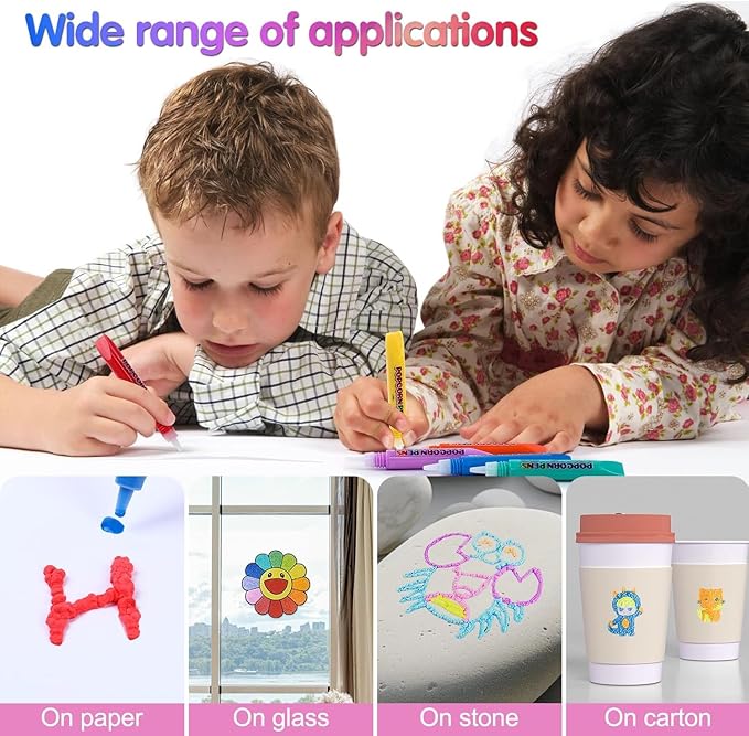 - 【Magic Popcorn Puffy Pen】Experience enchanting art with our DIY bubble popcorn drawing pens, get ready for creative adventures like never before! magic popcorn puffy pens are desigened to create a unique and magical puffy effect when heated with a hairdryer, turning your art into a textured masterpiece. Your children will be amazed and delighted as they witness the magical transformation of the bubbles.
